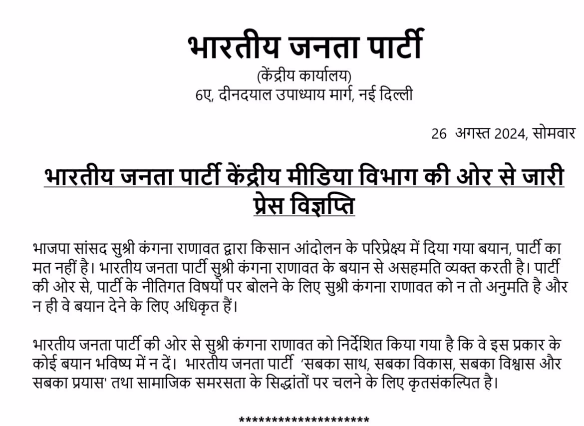 The BJP's central media department issued an official statement regarding Kangana's controversial comments on the farmers' protest, asserting, "The statement given by BJP MP Kangana Ranaut concerning the farmers' protest does not reflect the party's views. The BJP disagrees with Kangana Ranaut's statement. She is not permitted to speak on the party's policy issues and is not authorized to make such statements. From the party's side, Kangana Ranaut has been instructed to avoid making such comments in the future."