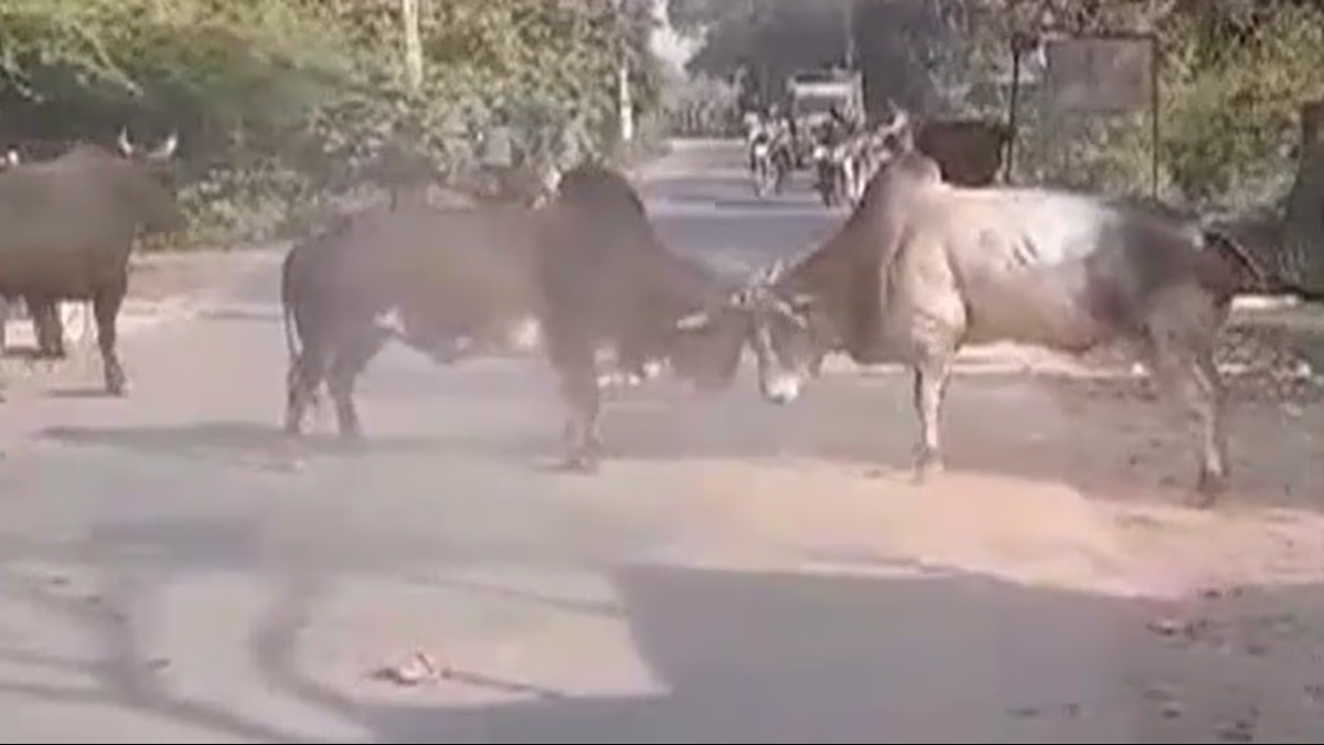 It all happened near Tingai village on Akbarpur Rura Road, where a herd of stray animals strolled across the road. Suddenly, a pair of bulls began fighting right in the midst of traffic, causing a temporary standstill. A growing crowd gathered to witness the scuffle and some pulled out their mobile phones to capture the fight, humorously narrating it as a metaphor for political rivalry.