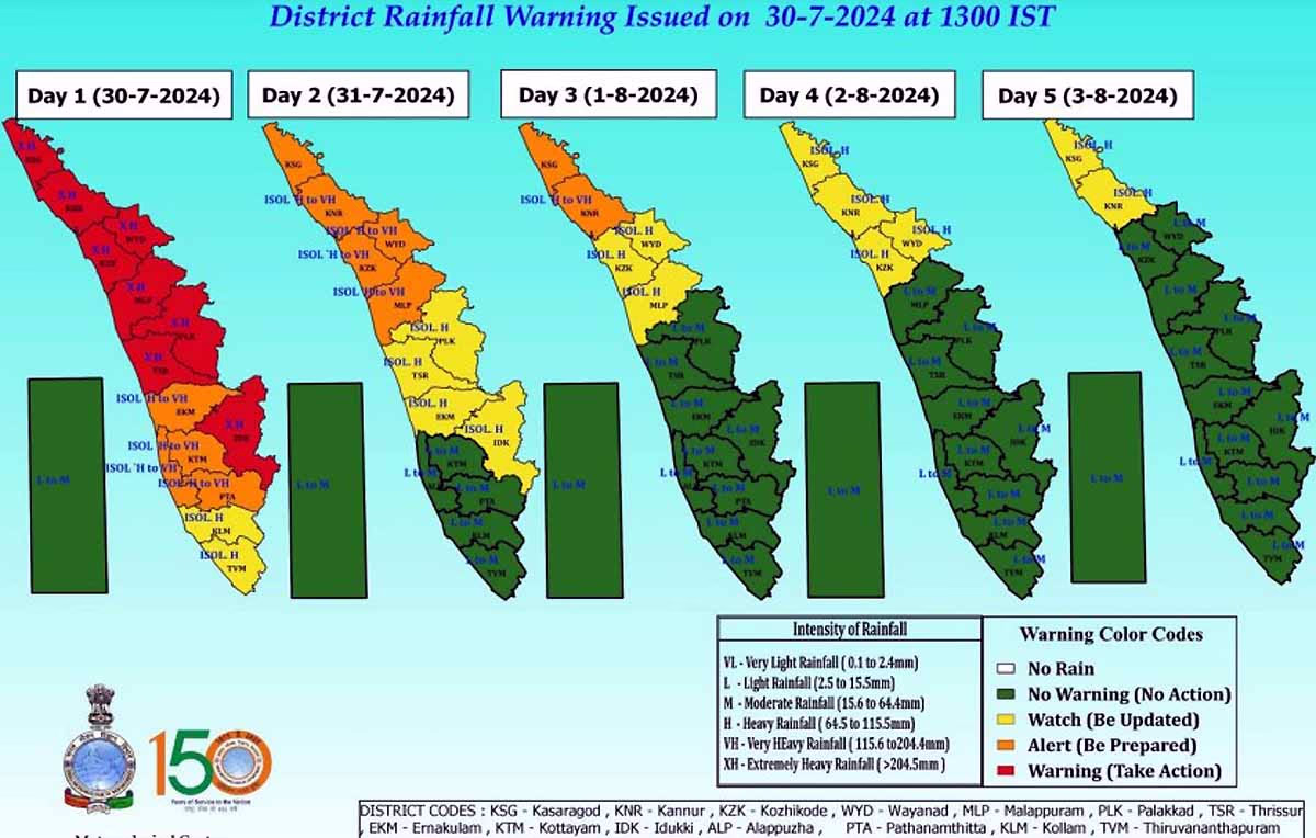 The weather department specifically stated that from July 30th to 31st, intense rainfall is expected. The first 24 hours may see 7 to 11 centimeters of rain, and the next day could bring 12 to 20 centimeters. Wayanad, Idukki, Thrissur, Palakkad, Kozhikode, Kannur, and Kasaragod will be affected. Rescue operations continue in Wayanad amidst the rain.