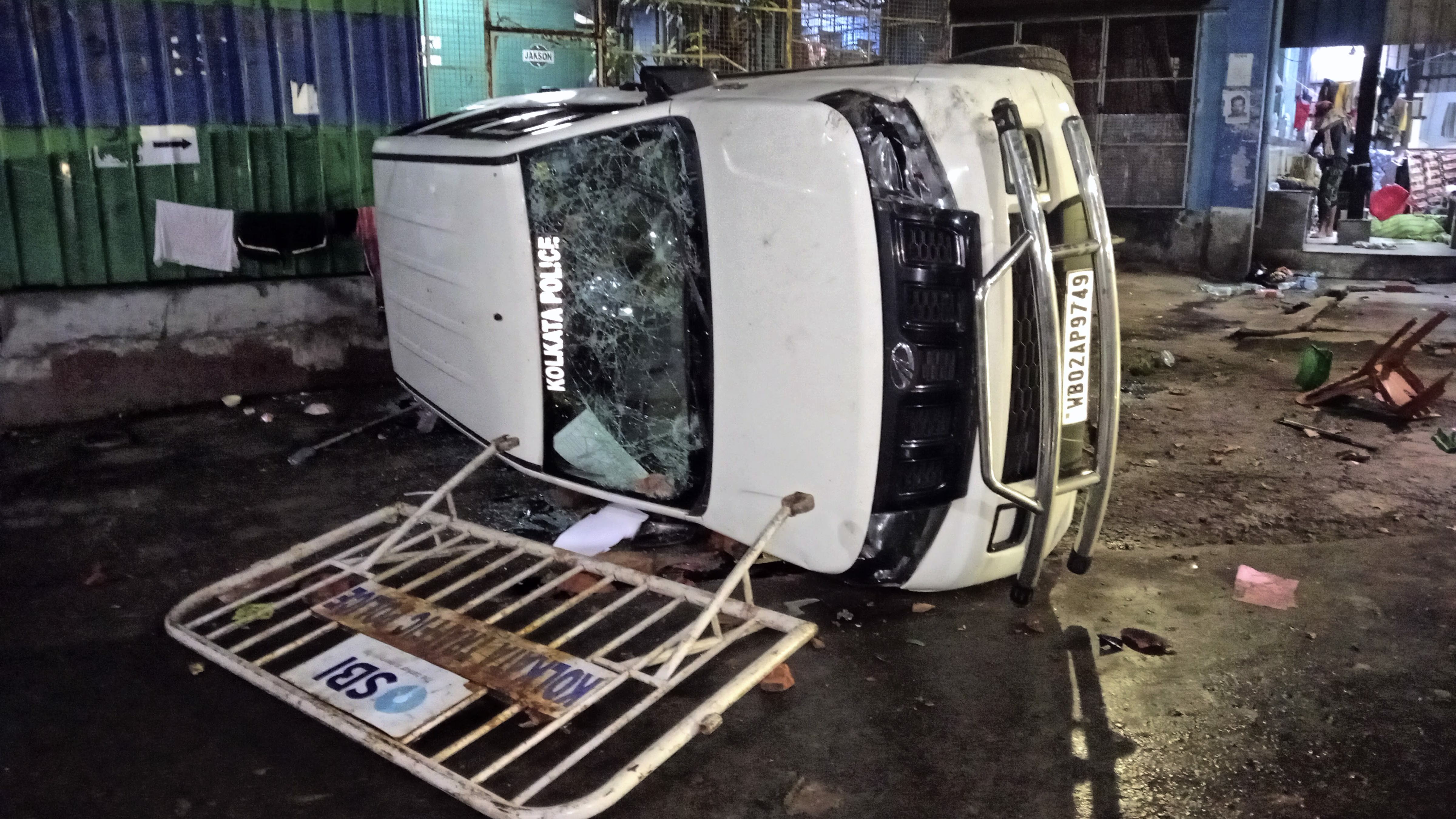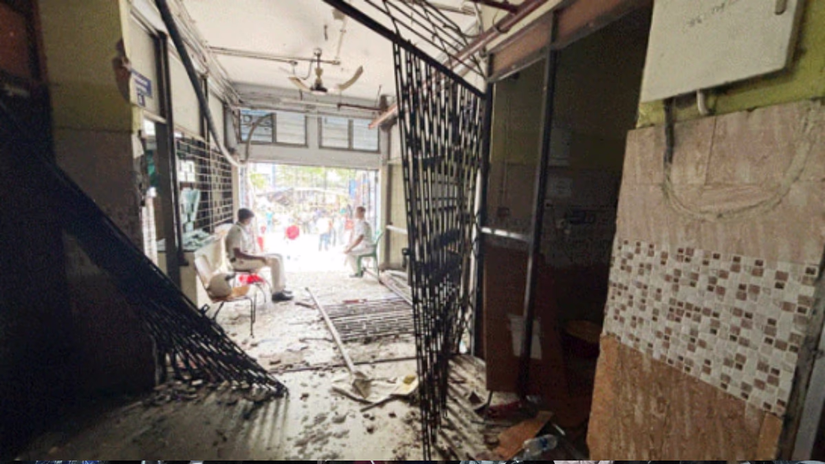 Broken barricades and chairs are scattered. Doors and windows of the hospital were uprooted. Police vehicles stationed outside the hospital were also vandalized. The chaotic mob outside the hospital even disrupted the protest by resident doctors. Banners and tents were torn, and personal belongings were scattered everywhere.