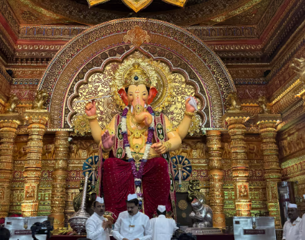 This year again, the grandeur of Lord Ganesh's idol ignites devotees' enthusiasm. Inside, lies a colossal idol decked in gold and colorful decor, under an intricate canopy of floral arrangements and carved walls adding to its magnificence. Devotees cherish the moment by capturing this divine view on their devices.