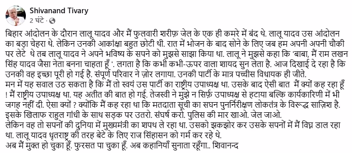 Recalling the days of the Bihar Movement, when Shivanand Tiwari and Lalu Yadav were imprisoned together, Tiwari wrote in his Facebook post, 'We were both confined in the same cell at Phulwari Sharif Jail. Lalu was a prominent figure of the movement, yet his aspirations were modest. After dinner, as we lay on our cots, Lalu shared his dream with me, stating, “Baba... I want to become a leader like Ram Lakhan Singh Yadav.”'