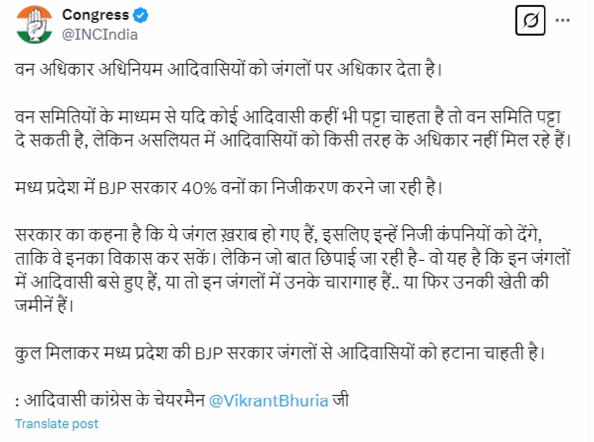 The Congress has accused the BJP government in Madhya Pradesh of planning to hand over 40% of the state’s forests to private entities. The party argues that this move intends to displace indigenous tribes from their ancestral homelands. Recently appointed Tribal Congress President, Vikrant Bhuria, accused the BJP of undermining the constitutional rights of tribes and seizing their lands. The MP BJP countered by dismissing the claims as baseless propaganda. However, Bhuria has yet to provide detailed evidence for his allegations.