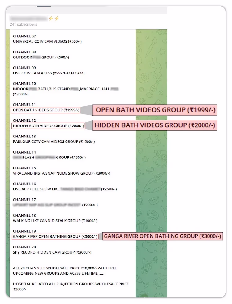 We identified two Telegram channels offering access to private groups where secretly recorded videos of women bathing or changing clothes are shared. These videos circulate under group names like “