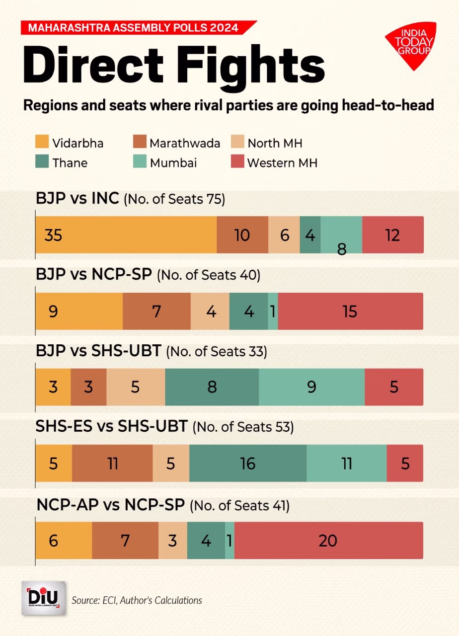 Maharashtra's main political clashes are Congress vs. BJP, Shiv Sena (Shinde) vs. Shiv Sena (Uddhav), and NCP (AP) vs. NCP (SP). They go head-to-head on 169 seats, forming nearly 60% of the 288-member Maharashtra Assembly's strength. Congress and BJP face off on 75 seats: Vidarbha (35), Western Maharashtra (12), Marathwada (10).
