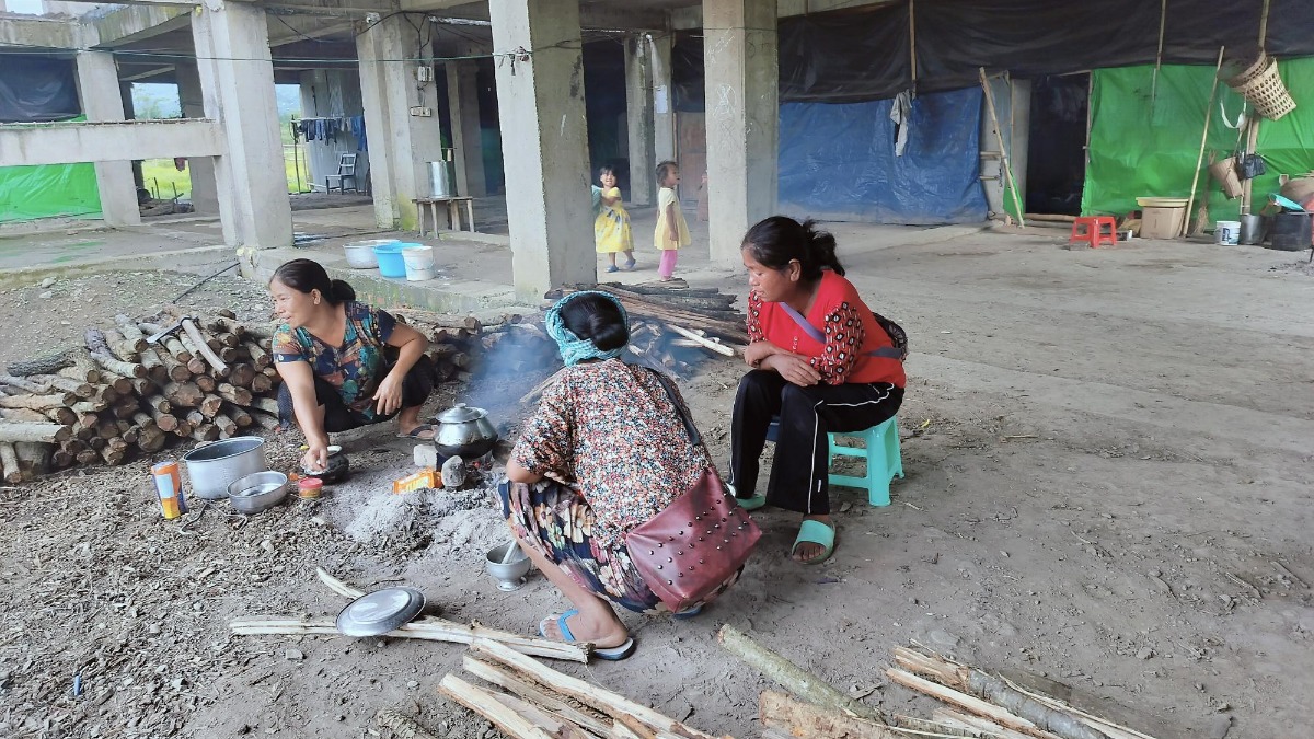 Prior to entering town, makeshift relief camps appear, not government-run but shelters improvised in unfinished buildings. Around 137 Kukis from the Thoubal district reside here, having fled the violence. Local NGOs and church groups provide meals – with vegetables boiling, rice steaming.