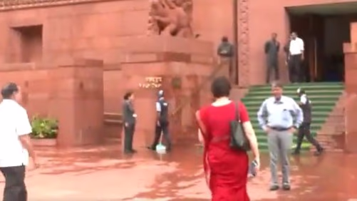 The video captures Priyanka Gandhi entering the Parliament, with Manish Tiwari seen standing at the entrance. Upon noticing Priyanka, he smiles and converses with her, before Priyanka makes her way inside the Parliament.