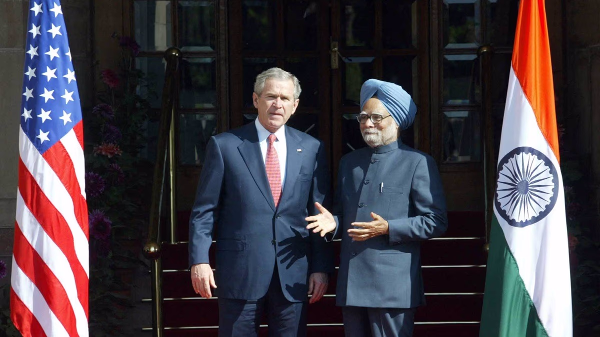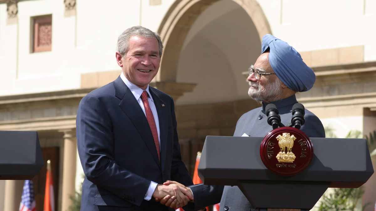 In this photo from March 2, 2006, U.S. President George W. Bush (left) and Indian Prime Minister Manmohan Singh stand side by side at Hyderabad House in New Delhi before holding a bilateral meeting. A year later, on November 16, 2006, the U.S. Senate passed a landmark civil nuclear agreement with India, initially proposed by the leaders as a strategic move to strengthen ties. (Photo by Ravindran/AFP Files/AFP)