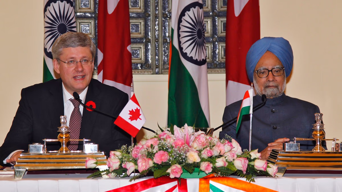 Pictured here is Canadian Prime Minister Stephen Harper (left), addressing the media with his Indian counterpart Manmohan Singh on November 6, 2012, in New Delhi, after signing ceremonies. These agreements enabled Canadian companies to export uranium and nuclear reactors to India for the first time. (Photo - Reuters)