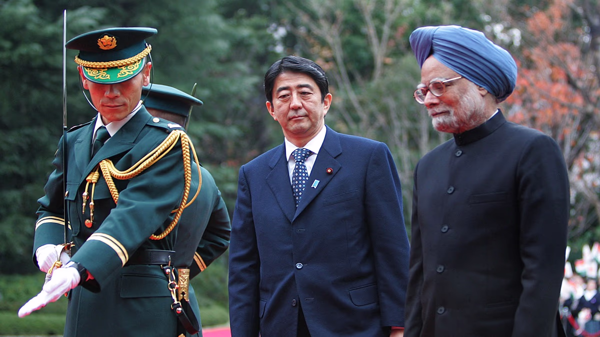 India's Prime Minister Manmohan Singh (right) is pictured with his Japanese counterpart Shinzo Abe at a welcoming ceremony led by an honor guard at the Prime Minister's official residence in Tokyo on December 14, 2006. Singh arrived in Japan for a four-day official visit on December 13. (Photo - Toshiyuki Aizawa/Pool/AFP)