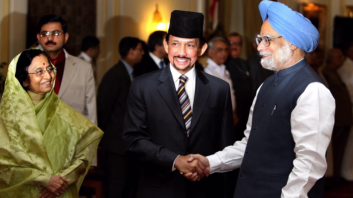 The photograph shows the formal welcome ceremony on May 20, 2008, at Rashtrapati Bhavan in New Delhi, where Indian Prime Minister Manmohan Singh (right) is seen shaking hands with Sultan Hassanal Bolkiah of Brunei Darussalam (center), as Indian President Pratibha Patil (left) looks on. (Photo: Prakash Singh/AFP)