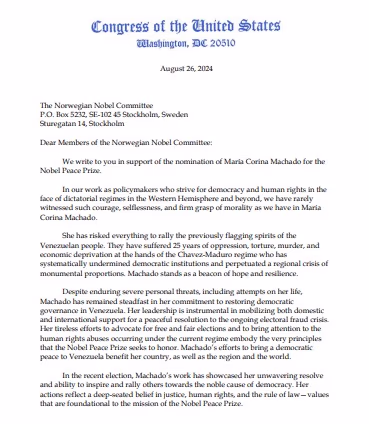 The lawmakers wrote, "She has remained steadfast in her commitment to restoring democratic governance in Venezuela." They referenced her 'peaceful resistance to tyrants' and efforts to garner global support for democratic change. Written on August 26, 2024, the letter describes her as 'a beacon of hope and resilience', embodying the principles the Nobel Peace Prize seeks to honor.