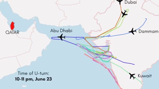 Similarly, three Jazeera Airways flights heading to Delhi, Kochi, and Thiruvananthapuram from Kuwait also had to return. Jazeera's flight JZR405 had crossed Qatar but made a U-turn at 10:19 PM Indian time.