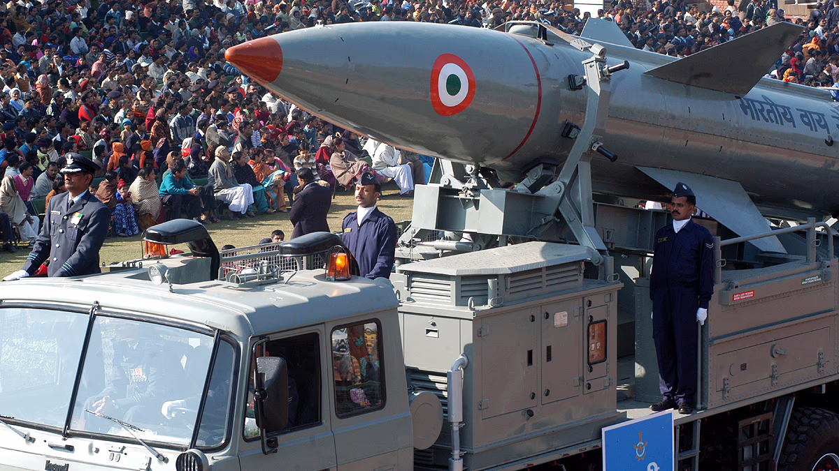 Known as an intercontinental ballistic missile, this is one of India's strongest. Weighing between 50,000 and 56,000 kilograms, it is 17.5 meters long and can carry a weapon weighing up to 1500 kilograms. It uses a three-stage solid fuel rocket capable of carrying nuclear weapons over a range of 5500 kilometers, encompassing half of the globe, including China and Pakistan.