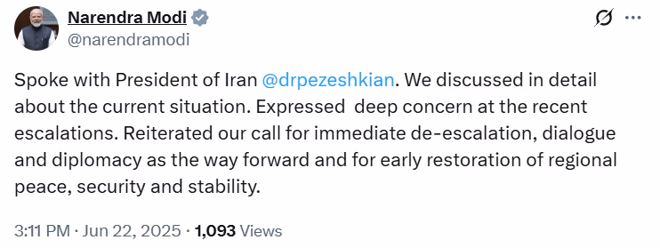 The escalating conflict between Israel and Iran has drawn the United States into the fray. Last night, U.S. B-2 bombers conducted significant airstrikes on three key Iranian nuclear sites. In response, Indian Prime Minister Narendra Modi had a telephonic conversation with Iranian President Masoud Pezheshkian. PM Modi shared this update via X, stating, 'I spoke with Iranian President Pezheshkian about the ongoing situation. We discussed it in detail. I expressed my deep concern about the military conflict and reiterated the call for dialogue and diplomacy to reduce tensions promptly. I emphasized the need for the swift restoration of regional peace, security, and stability.'