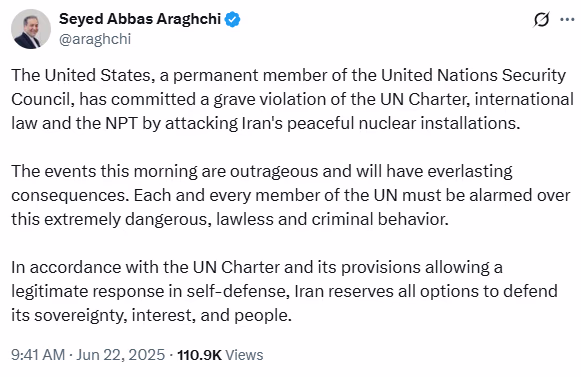 Araghchi urged all UN members to be concerned about this perilous, chaotic, and criminal behavior. Referring to provisions of the UN Charter, he stated that Iran reserves all options to exercise its right to self-defense. Moments after the Foreign Minister's post, Iran's Foreign Ministry also issued a stern condemnation, describing the attacks as a direct assault on its sovereignty, urging immediate action by the UN Security Council and the International Atomic Energy Agency (IAEA).