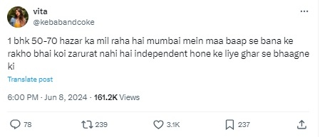 Amidst this scenario, a post from a Mumbai-based girl on social media has gained traction. Posted on June 8th by the user @kebabandcoke, it reads: 'In Mumbai, 1 BHKs are going for 50-70 thousand. Maintain good relations with your parents, folks—there's absolutely no need to run away from home in pursuit of independence.'