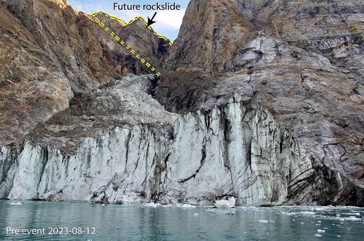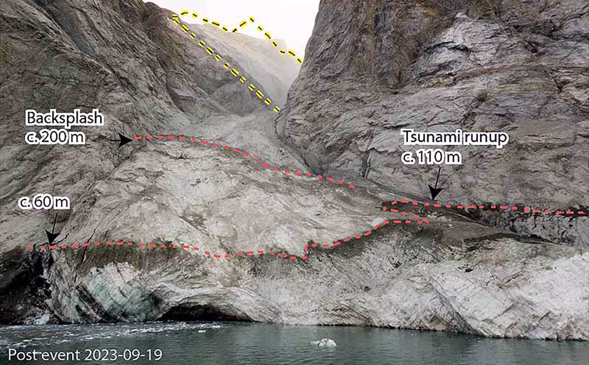 Another reason for the mega-tsunami in the fjord was the unstable peak of a mountain tumbling down. This event unloaded 25 million cubic meters of rock and ice, equivalent to the area of 10,000 Olympic swimming pools, straight into the fjord, amplifying the tsunami's power.