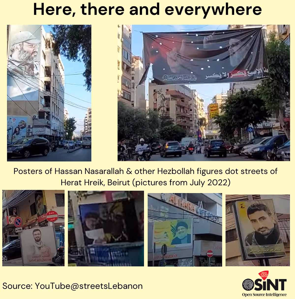 Once you enter, a different scene unfolds. People carrying assault rifles, dressed in camouflage uniforms, praising resistance in Arabic. Posters and banners of Hassan Nasrallah in black turbans surround you.