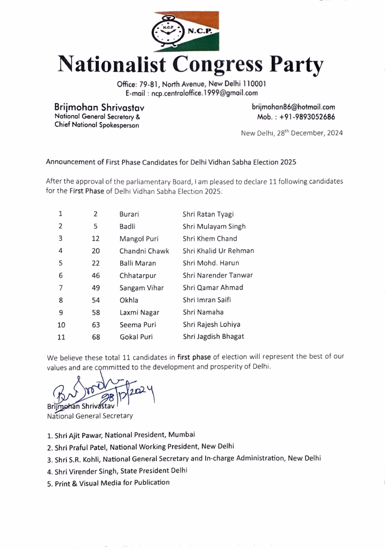 Among the contenders, NCP has fielded Ratan Tyagi from Burari, Mulayam Singh from Badli, Khem Chand from Mangol Puri, Khalid Ur Rehman from Chandni Chowk, Mohammad Haroon from Ballimaran, Narendra Tanwar from Chhatarpur, Kamar Ahmed from Sangam Vihar, Imran Saifi from Okhla, Shri Nama from Laxmi Nagar, Rajesh Lohia from Seemapuri, and Jagdish Bhagat from Gokalpuri. Notably, the elections for the 70-member Delhi assembly are slated for February. Intriguingly, the NCP list includes 4 Muslim candidates, highlighting the party's inclusive approach.