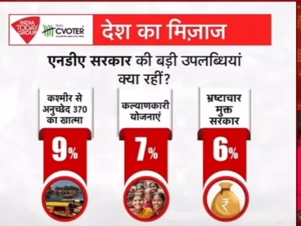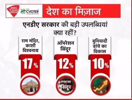 What are the NDA government's major achievements? 17% of respondents acclaimed the Ram Temple and Kashi Vishwanath Corridor. Additionally, 12% highlighted Operation Sindoor, 10% applauded infrastructure development, and 9% praised the abrogation of Article 370 in Kashmir. Welfare schemes were noted by 7%, while 6% viewed a corruption-free government as a significant achievement.