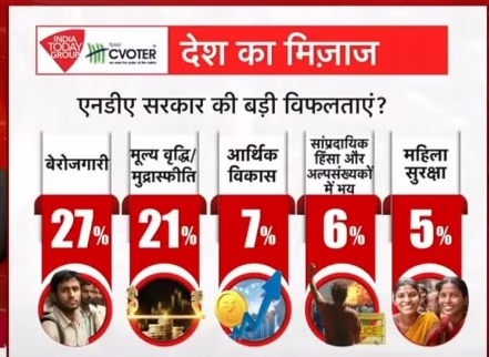 As for the NDA government's significant failures, 27% of participants pointed to unemployment. Price rise or inflation was another concern for 21%, while 7% were concerned about economic progress. Communal violence and minority fears worried 6%, and 5% saw women's safety as a major failure.