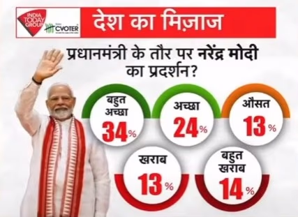 When asked about Prime Minister Narendra Modi's performance, 34% of respondents rated it as excellent, 24% as good, 13% as poor, and 14% as very poor.
