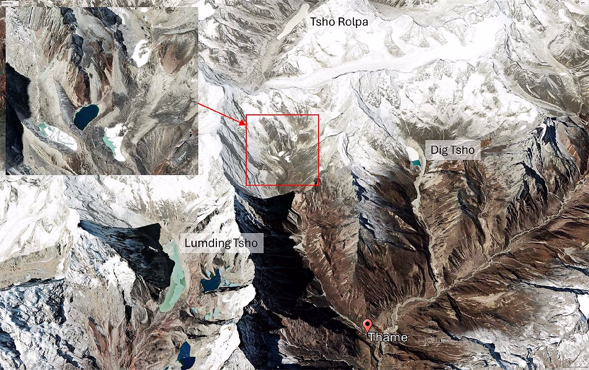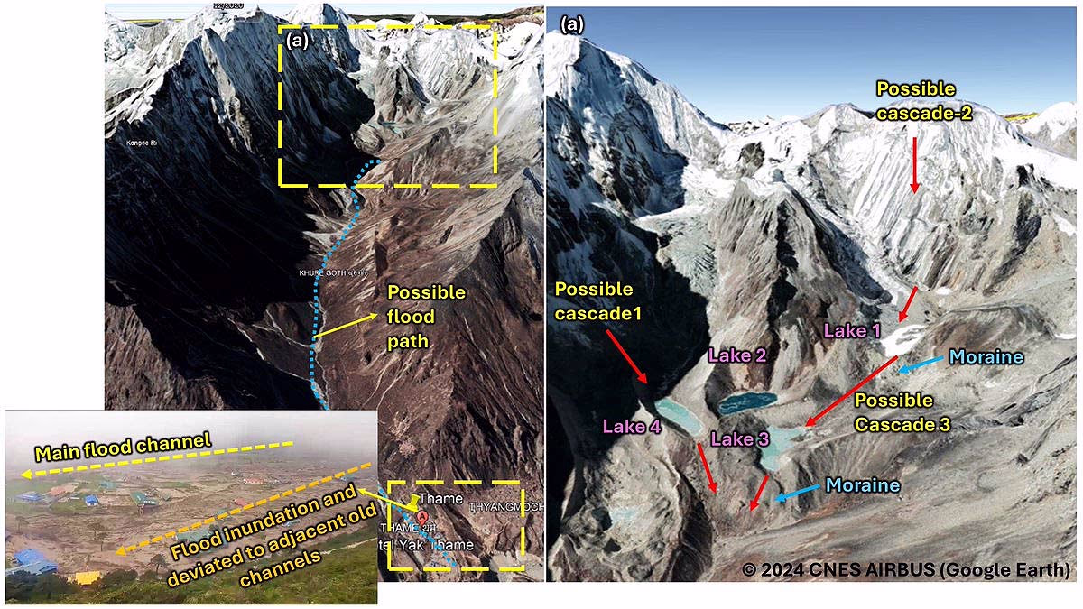 The bursting of the Thengbo Glacier lake increased the Thame River's flow, causing flooding in its branch, the Dudh Kosi. Landslides occurred, devastating half of Thame Village. This lake was near Tashi Lapcha Pass, an area experiencing persistent rainfall. The map below can provide a clearer understanding.