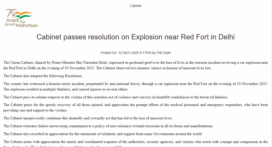 At a cabinet meeting chaired by Prime Minister Narendra Modi, the central government declared the car blast near Red Fort a terrorist incident and expressed deep sorrow over the attack. The cabinet observed two minutes of silence in memory of the innocent victims who perished in the assault.