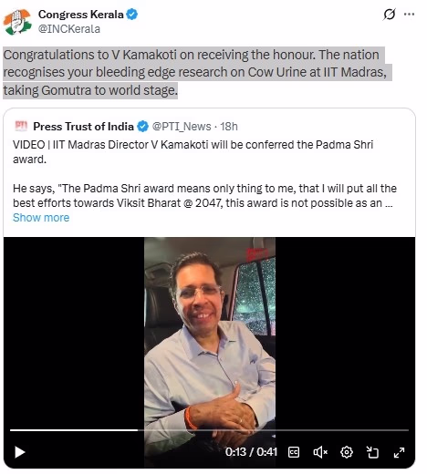 Following V Kamakoti's honor, Kerala Congress posted on their official X account, "Congratulations on V Kamakoti’s honor. The nation recognizes your outstanding research on cow urine at IIT Madras, which has placed it on the global stage."