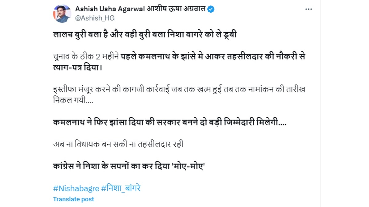 On the other side, BJP has taunted Nisha Bangre's plea to return to administration. BJP's state media in-charge Ashish Agrawal remarked on X, 'Greed leads to downfall, and it has indeed taken Nisha Bangre down. Resigned from her SDM role two months before the elections, lured by Kamal Nath's deception.'