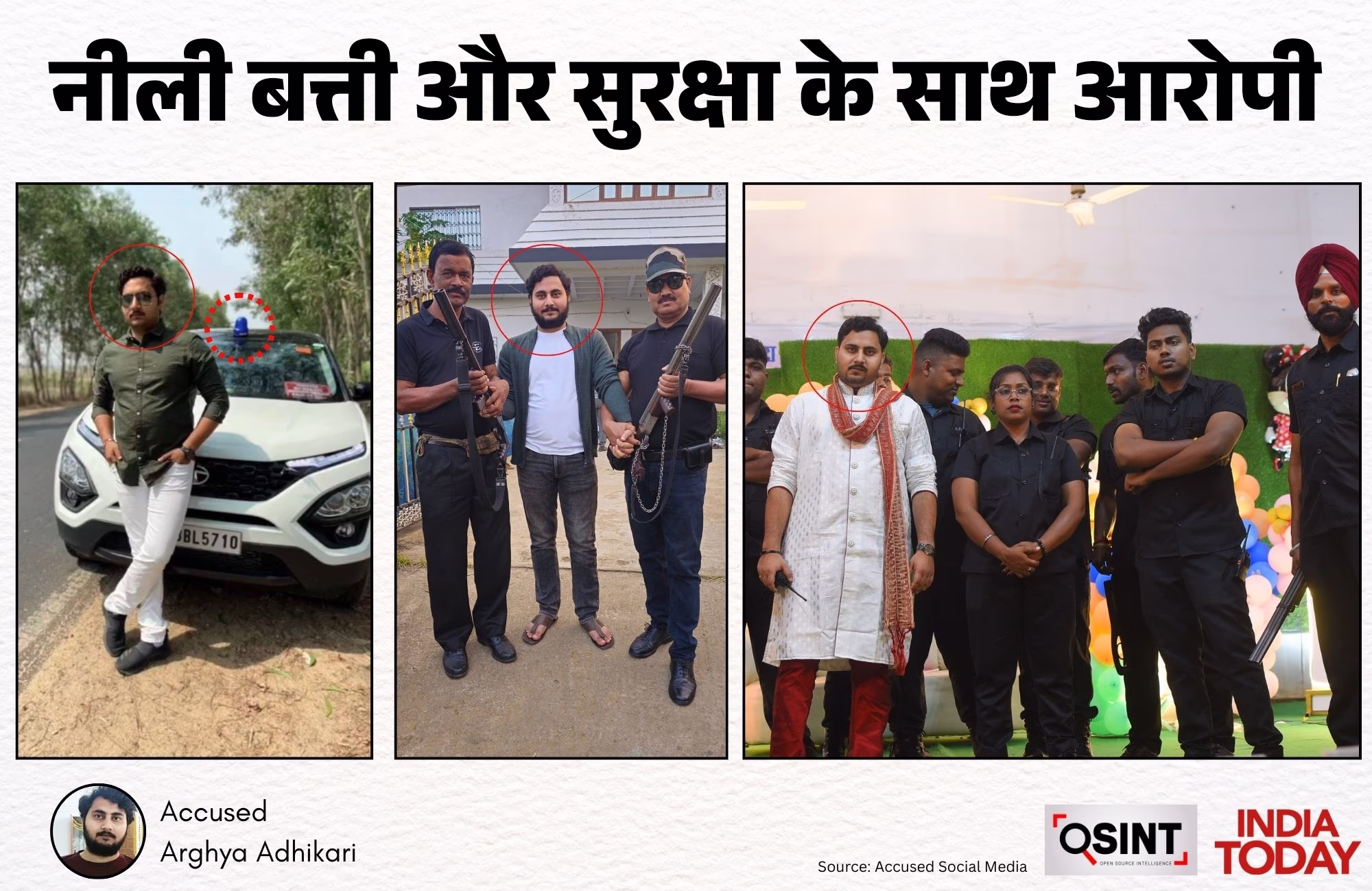 Images showcased Arghya posing with escort cars flashing blue lights and armed bodyguards.