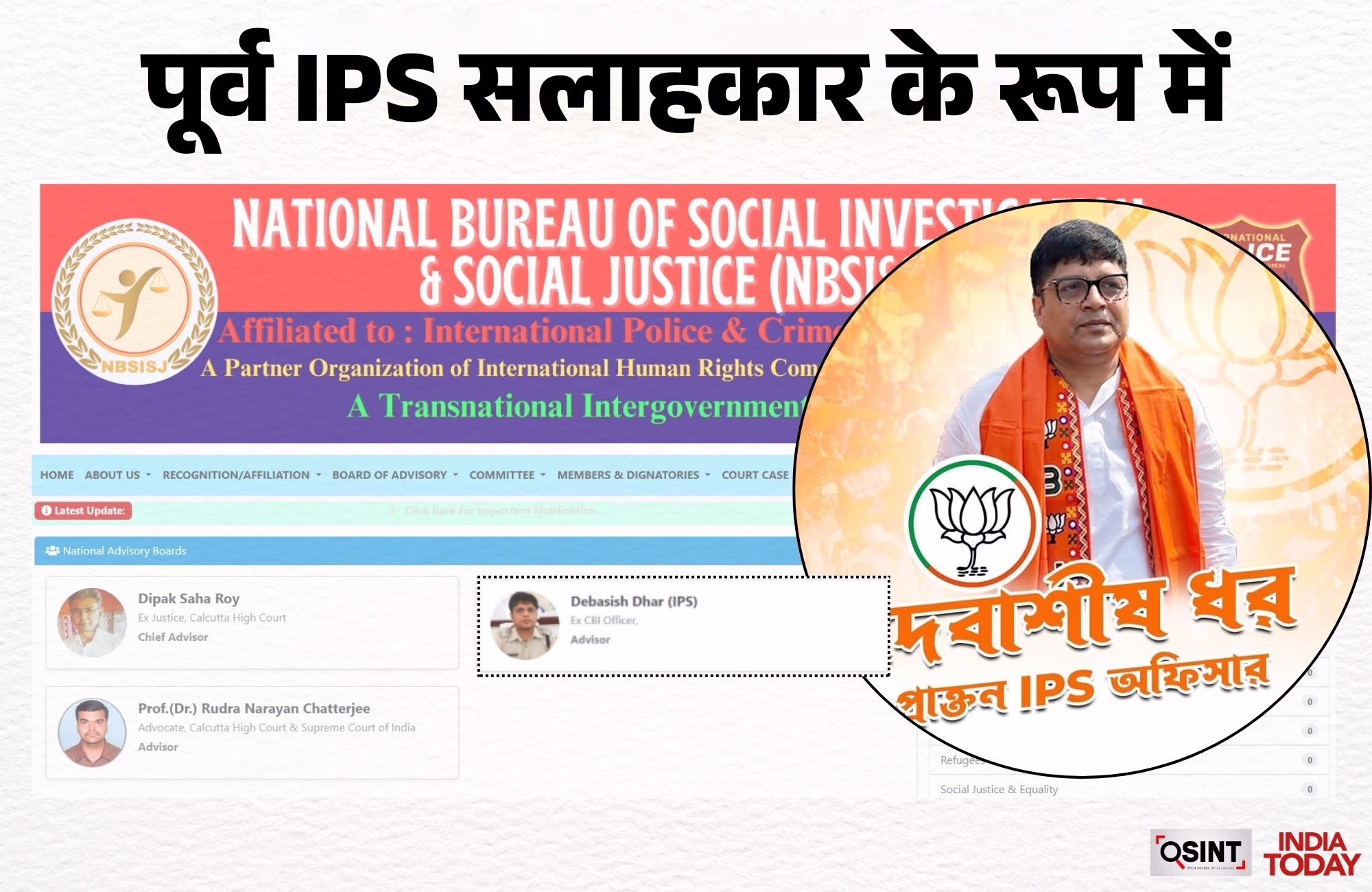 The website boasted affiliations with several ministries, including the Ministry of Social Justice and Empowerment, the Ministry of Tribal Affairs, and the Ministry of AYUSH. The International Police and Crime Investigation Bureau's website depicted former Calcutta High Court Judge and ex-IPS officer and BJP leader Debashish Dhar as an official.