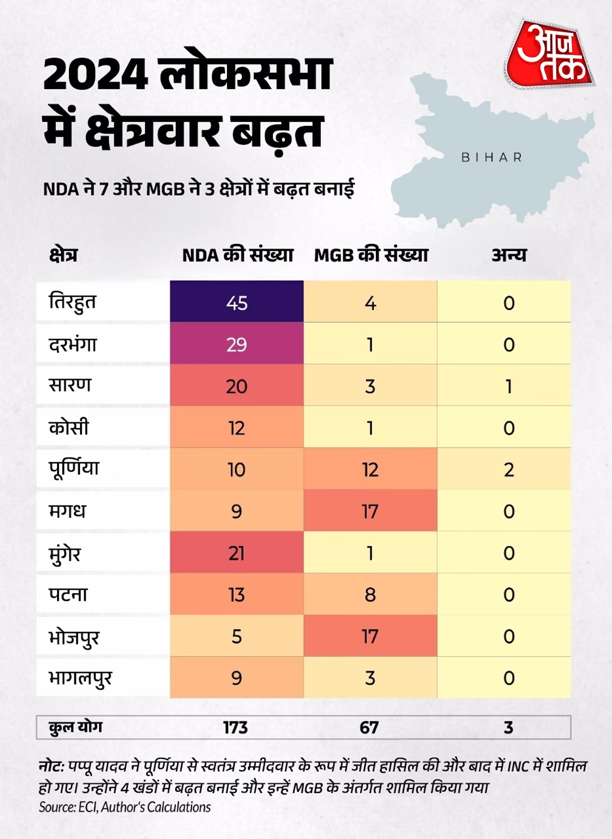 In the 2024 Lok Sabha elections, NDA extended its lead. Their Assembly margin of 125-110 expanded to 173-67 in Lok Sabha. NDA led in seven zones, the Grand Alliance in three. In North Bihar, NDA secured 116 out of 140 seats, 30 more than in 2020. They overtook Saran from the Grand Alliance, while Purnia was won by the Grand Alliance after Congress aligned with Pappu Yadav. In South Bihar, NDA led (57-46). The Grand Alliance dominated Bhojpur and Magadh, while NDA claimed Munger and Patna.