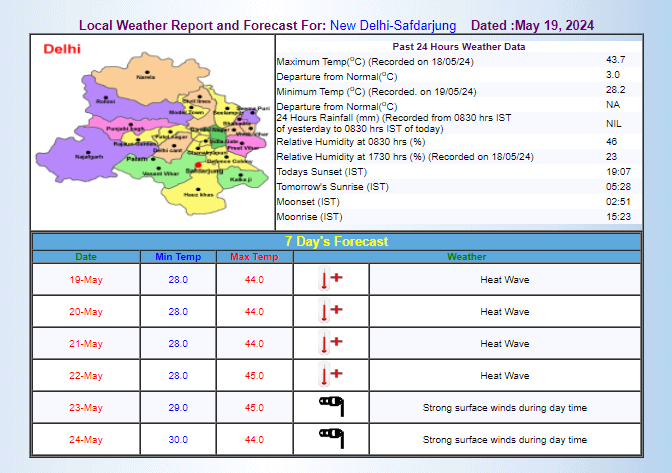 The India Meteorological Department suggests that throughout this week, Delhi could see maximum temperatures wavering between 44 to 45°C, with the minimum temperatures expected to lie in the 28 to 30°C range.