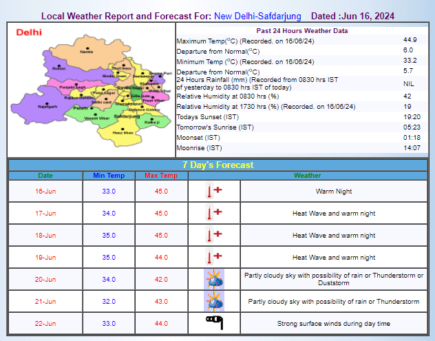 Delhi continues to face a torrid heatwave with an orange alert in effect till June 19th. Yet, the weather might take a turn from June 20th, with potential thunderstorms and light showers anticipated alongside persistent breezy conditions. The IMD forecasts this week's temperatures to soar between 42-45°C at their peak and hover around 32-35°C at their lowest in Delhi.