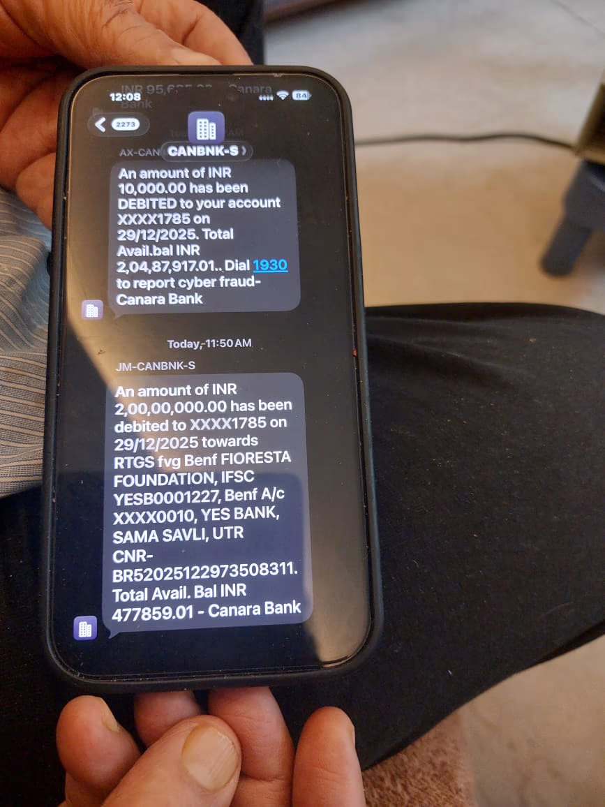 Canara's account statement features an entry of December 30, 2025, denoting an RTGS transfer of ₹2 crores to an account, complete with a UTR number, RTGS charges, and the bank branch code. SMS alerts on their phone illustrate ₹10,000 debited on December 29, 2025, with a subsequent RTGS transaction of ₹2,00,00,000. It clarifies the funds went to Fioresta Foundation. Additionally, it advises dialing 1930 for reporting cyber fraud.