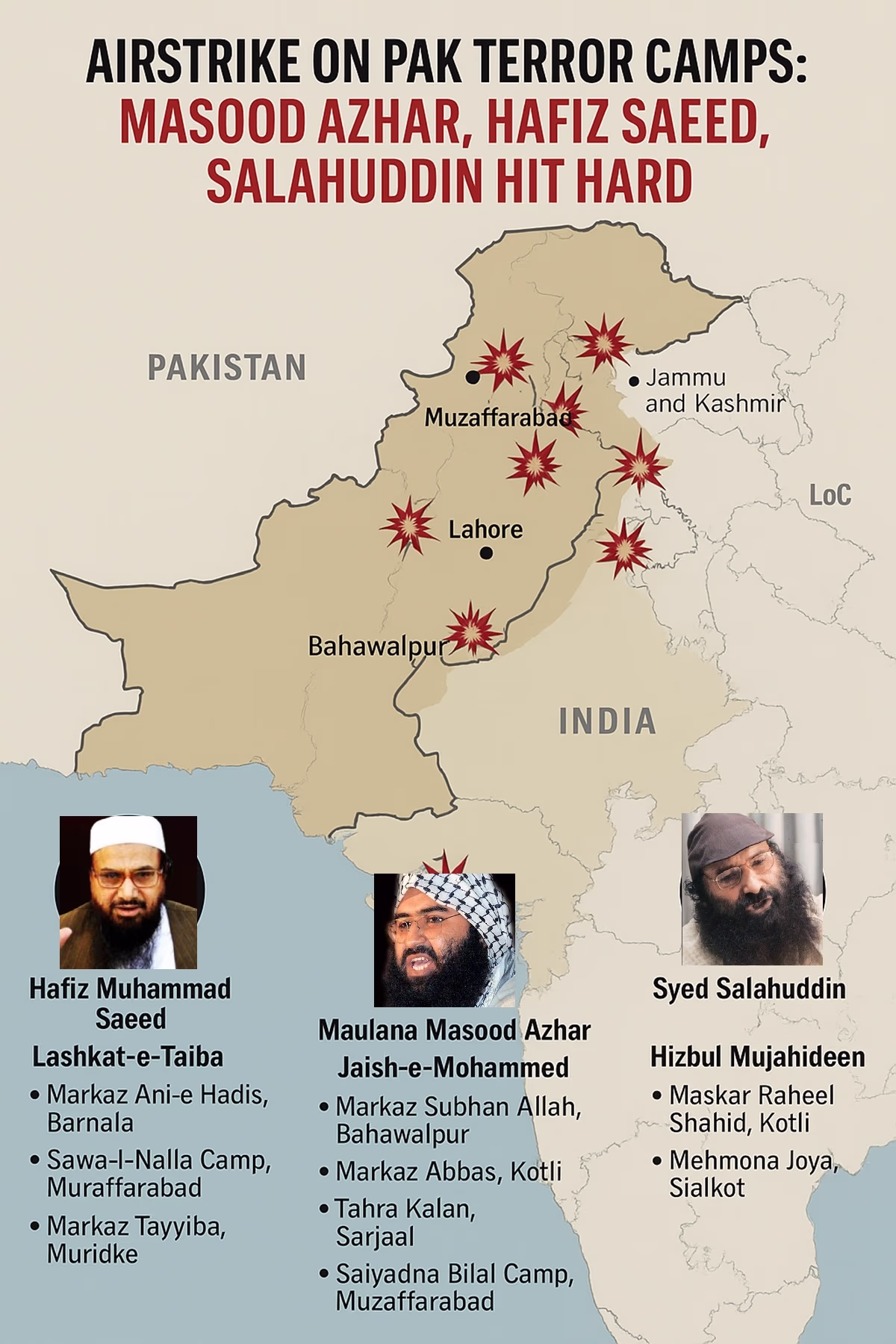 In a powerful response to the Pahalgam terror attack, India conducted precise airstrikes on nine key terror hideouts of Lashkar, Jaish, and Hizbul Mujahedeen in Pakistan. The overnight operation decimated all strategic locations, sending shockwaves among the terror leaders who never anticipated India's strategic strike. Many of these leaders are now grappling with the aftermath. Let's delve into how India's military avenged the atrocities and struck these terror masters.