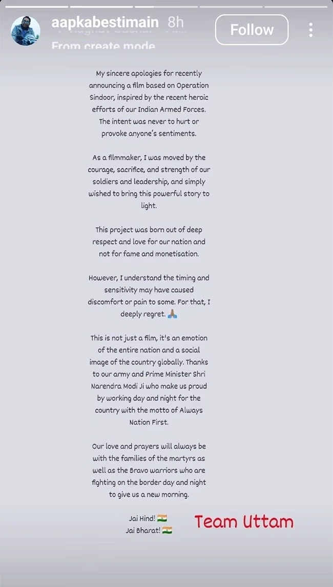 Moreover, director Uttam Maheshwari has apologized for announcing 'Operation Sindoor.' Following the announcement, Maheshwari faced a barrage of criticism from users, leading to a formal apology. He expressed that in the heat of the moment, he let emotions overpower him. He made it clear that his intent was never to hurt anyone's sentiments.