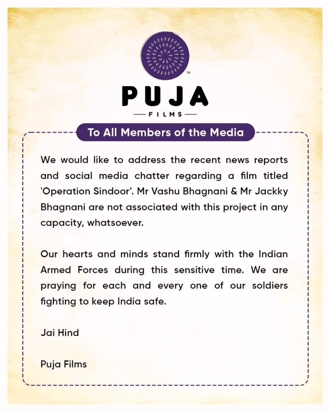 An official statement was released from Pooja Entertainment stating, "In light of recent news reports and social media rumors about a film named 'Operation Sindoor,' we want to clarify that Mr. Vashu Bhagnani and Jackky Bhagnani have no connection to this project. Our hearts stand with the Indian Army in this challenging time. We pray for every soldier battling to keep us safe."