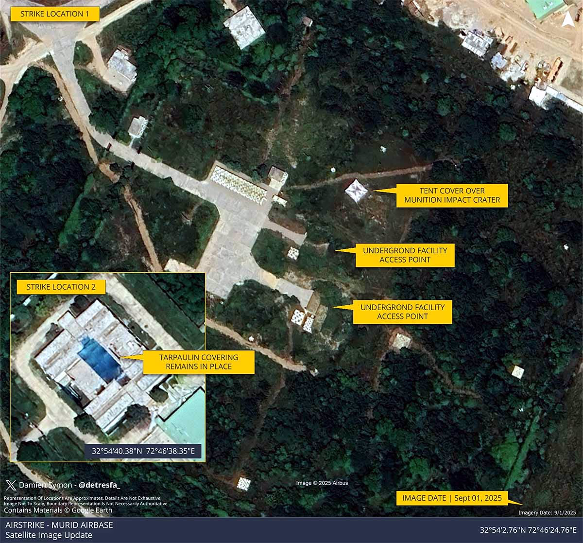 New revelations from Google's September 2025 satellite images confirm that the attack sites - the crater and damaged sections - remain covered. It appears Pakistan has concealed them with tarpaulin or other materials to enable ongoing repairs. While other bases like Sargodha had runway repairs completed by June 2025, progress at Muridke is slower.