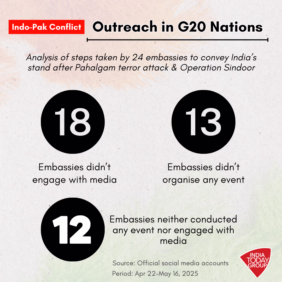 The Ministry of External Affairs (MEA) may have briefed foreign envoys in New Delhi, but our analysis shows that most Indian embassies in G20 nations did not engage with local media or organize events to shape public opinion regarding the Pahalgam attack or retaliatory strikes on terrorist sanctuaries in Pakistan.