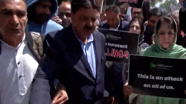 In Kashmir, the dreadful terrorist attack in the valley has sparked widespread anger. PDP head Mehbooba Mufti condemned the attack on tourists in Pahalgam and joined local protests. She emphasized that this attack affects us all. Members of the Dogra Front in Jammu and Kashmir also protested, condemning the terrorist attack on tourists.