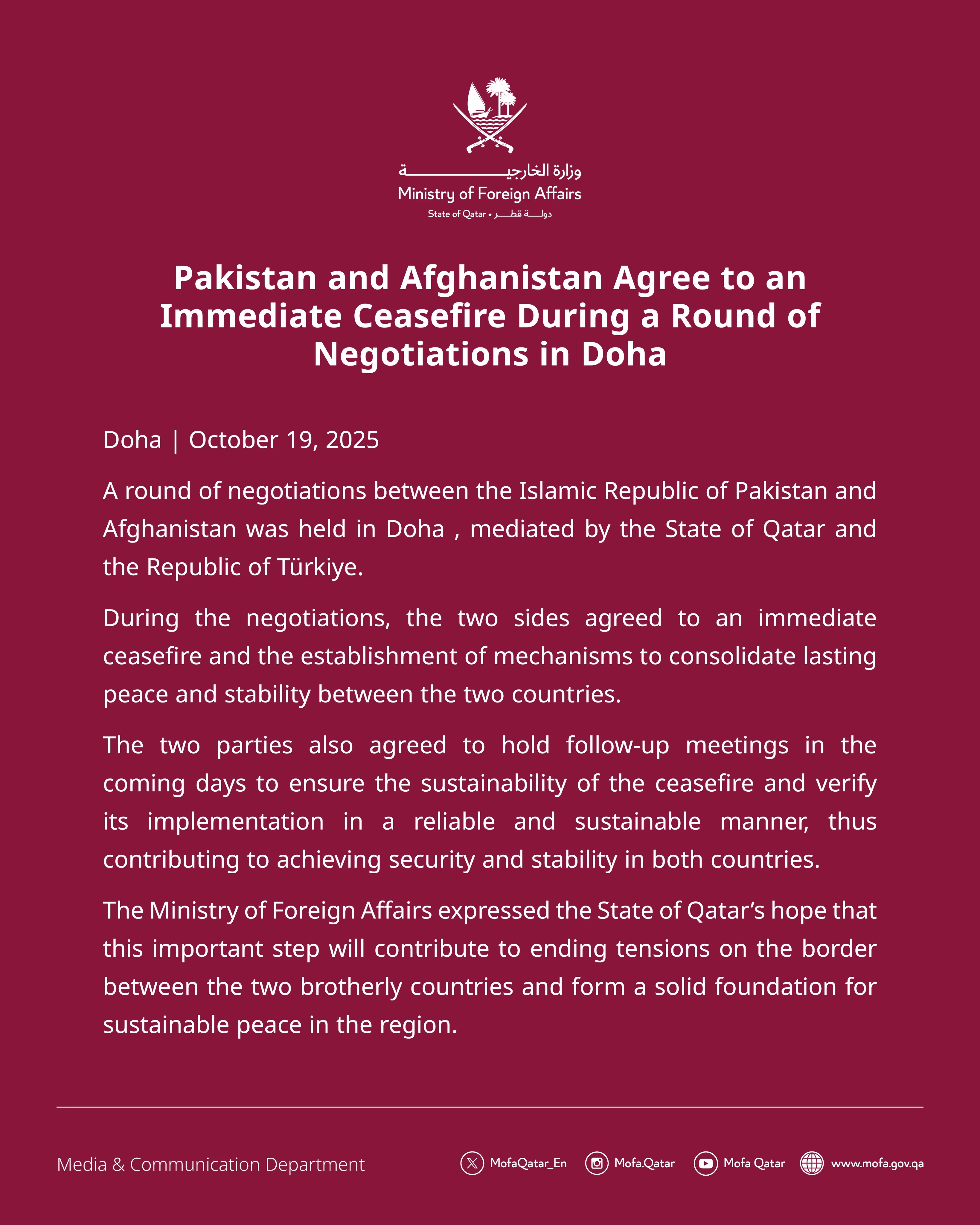 According to Reuters, Qatar stated that both sides have agreed to further meetings in the coming days to ensure a permanent ceasefire and its proper implementation. These talks follow recent border skirmishes that left many dead and hundreds injured, marking the most serious confrontation between the two neighboring countries since the Taliban's return to power in 2021.