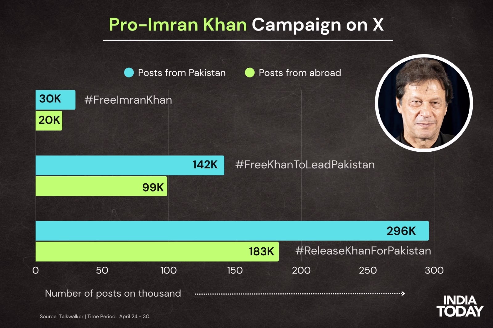 Over 300,000 posts have used the hashtag #ReleaseKhanForPakistan, according to X Analytics data. Another trending hashtag, #FreeImranKhan, saw over 35,000 posts by April 29.