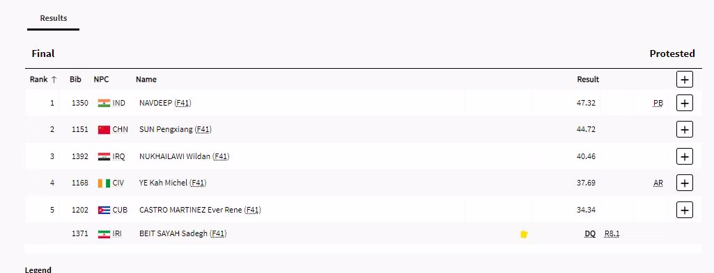 In the final, Navdeep Singh's best throw was 47.32 meters, achieved on his second attempt. Although Iran's Sadegh Siah Beyt had initially taken the lead with 47.64 meters, he was disqualified after the event, giving Navdeep the gold. China's Pengjiang Sun took silver with a throw of 44.72 meters, while Iraq's Wildan Nukhailawi won bronze with 40.46 meters.