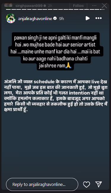 It is noteworthy that Pawan Singh apologized on Instagram's story, stating, "Anjali, I couldn’t watch your live due to a busy schedule, but I was informed about your words. I felt bad. My intentions were never wrong. However, if my behavior hurt you, I sincerely apologize."