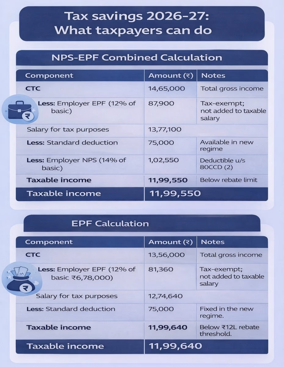 Jain emphasized that the upper limit of tax-free salary is attainable only when both EPF and NPS are part of the salary structure. He noted that if an employee opts for both EPF and NPS under the new tax regime, and the basic salary is about 50% of the CTC, almost 1.46 million rupees of total salary can be tax-free.