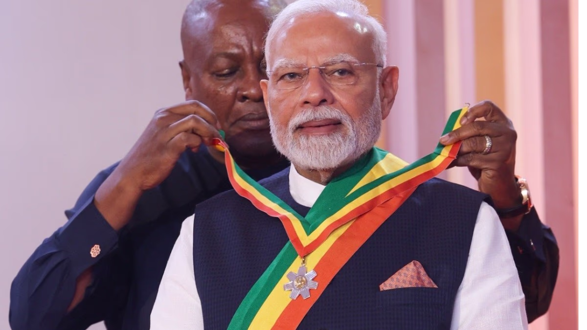 Prime Minister Narendra Modi embarked on a historic two-day bilateral visit to Ghana, his first to the West African nation. Upon his arrival at the Kotoka International Airport in Accra, PM Modi was received with great fanfare, including a grand 21-gun salute. During this momentous occasion, Ghana's President John Mahama conferred upon him the country's second-highest civilian award, the