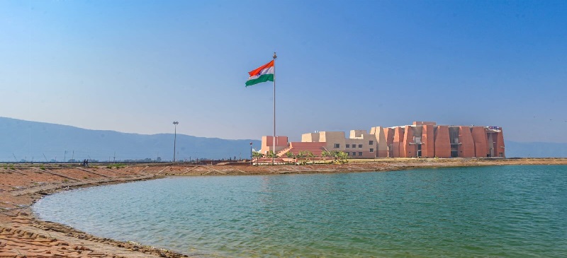 The Nalanda University campus is proud to be a 'NET ZERO' campus, focusing on environmentally-friendly activities and education. A water recycling plant has been installed, and with 100 acres of water bodies, the campus is designed to be eco-friendly.